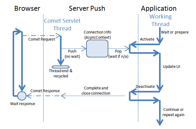 The comet implementation now supports Servlet 3 asynchronous processing. Servlet 3 brings with it the Thread per request model of handling connections meaning that a thread is not needed to keep a connection open and can be recycled. The comet implementation will now push its context to the serverpush queue which is processed using a working thread enabling the original request thread to be recycled.