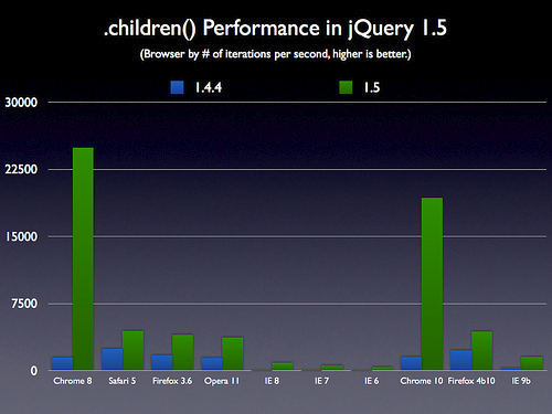ZK 6 upgrades the base jQuery version from 1.4 to 1.6. This brings about performance improvements within the UI layer such as when traversing the DOM and accessing components attributes. The following graphs are taken from jquery blogs and outline some of the performance improvements.