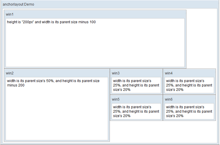 The Anchorlayout was written by Peter Kuo and enables developers to define the size of components relative to their parents. For more information on this component please visit the ZK Component Reference.