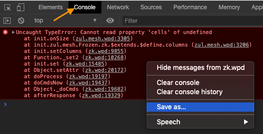 When you run into an issue in ZK, following this document can help you to provide the support team with sufficient data, thus speeding up the investigation and get prompt and efficient feedback. Here is a sample screenshot of an error. However, with only a screenshot, it is difficult for us to find enough clues and provide timely support. Instead of providing a screenshot, please follow the tips and instructions below when submitting your issue.